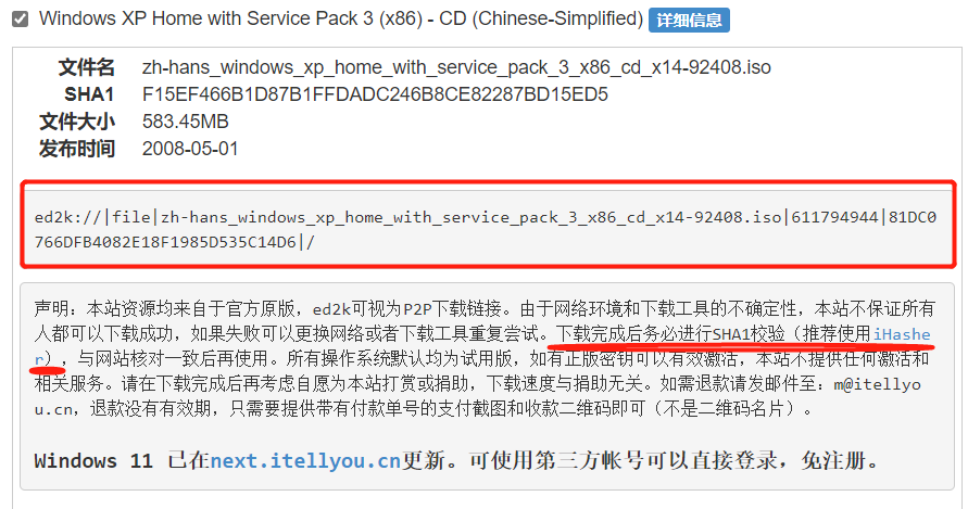 复制图中的ed2k码在迅雷中下载文件,下面的哈希值校验是为了进一步确认ISO文件是否纯净无毒 ,不放心的话可以检验一下。