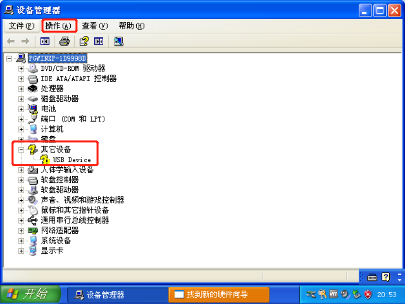 在设备管理器内点击“操作”,选择“扫描检测硬件改动”,这时会出现“其他设备”。