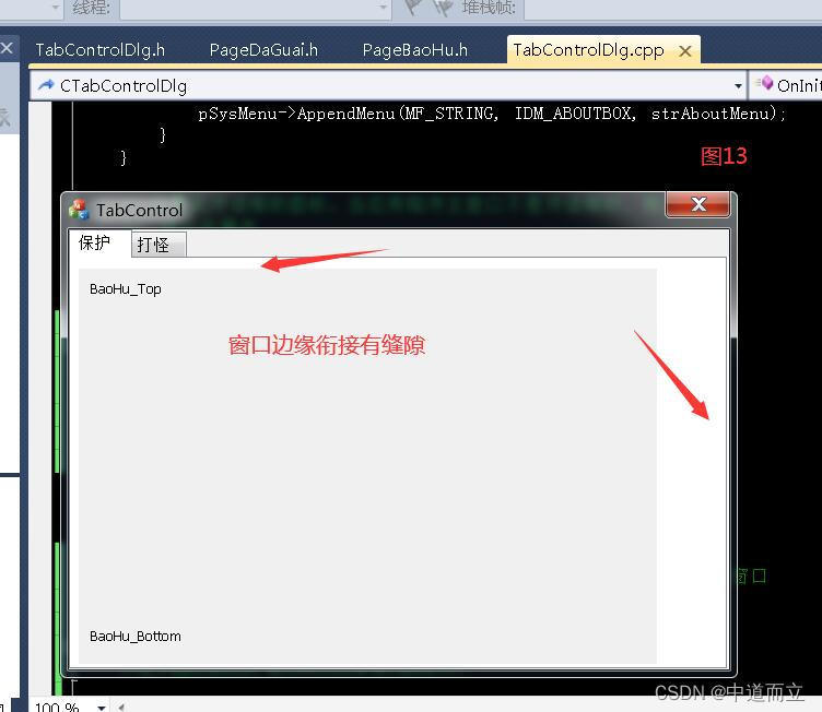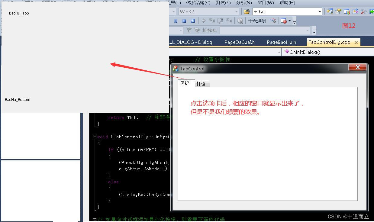 7.从图12中看,我们发现了个问题:显示的窗口在选项卡外面,这根本不是我们想要的效果,要解决这个问题,我们要为创建的窗口指定一个父窗口,代码如下: