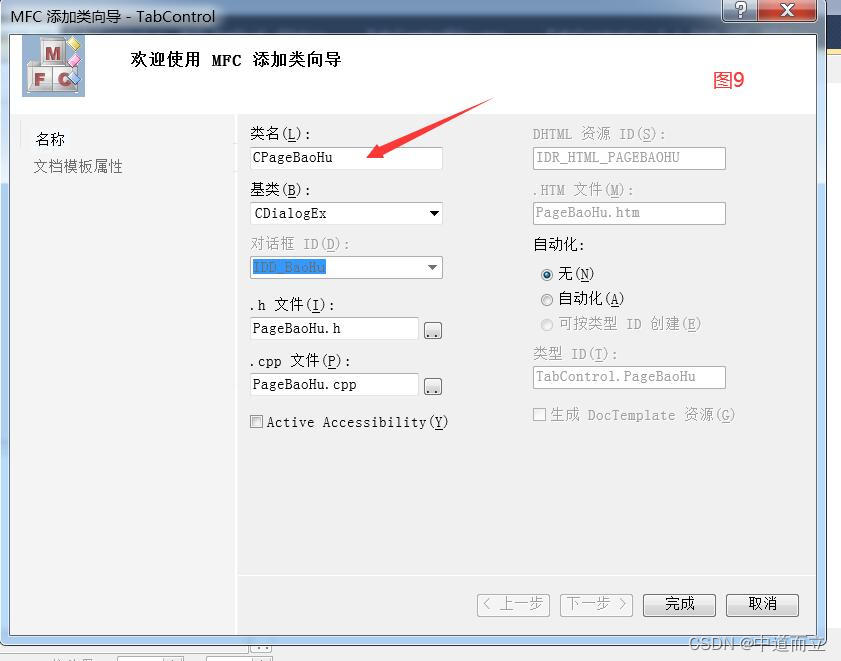 4.接着再为这两个窗口添加类(对应的类名为CPageBaoHu和CPageDaGuai),如下图(图9):