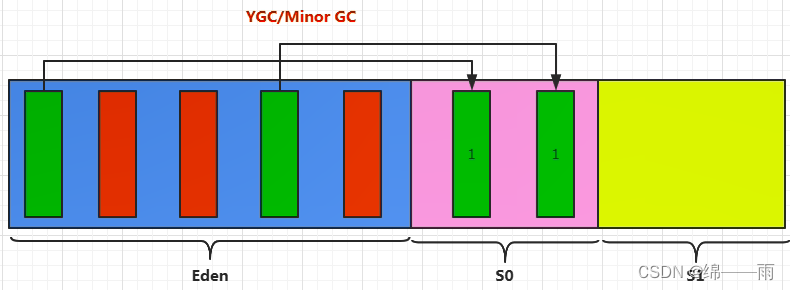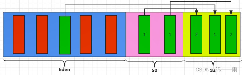 2、当我们进行一次垃圾收集后, 红色的对象将会被回收(不再被使用,没有引用指向他),而绿色的还被使用着,存放在S0(Survivor From)区。