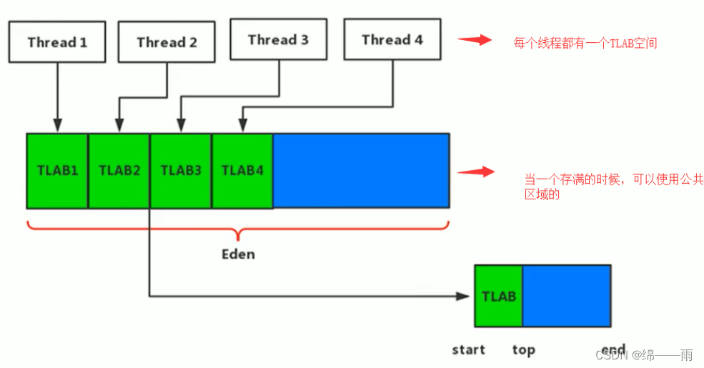 2、JVM为每个线程分配了一个私有缓存区域TLAB,将TLAB作为内存分配的首选