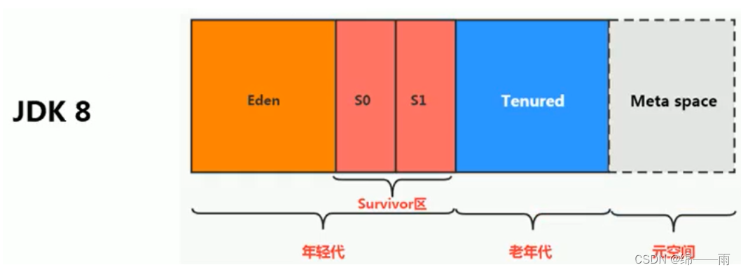 其中年轻代又可以划分为Eden空间、Survivor0空间和Survivor1空间(有时也叫做from区、to区,这两个区的大小是相等的)
