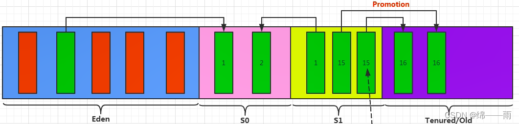 4、我们继续不断的进行对象生成和垃圾回收,当Survivor中的对象的年龄达到15的时候,将会触发一次 Promotion 晋升的操作,也就是将年轻代中的对象晋升到老年代中.