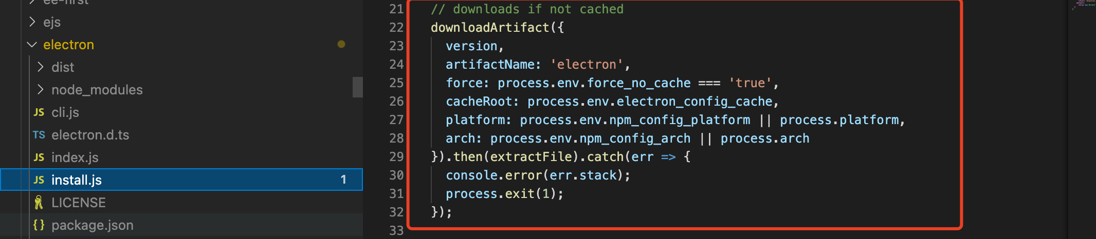 - 在node_modules文件夹中,找到electron文件夹,打开install.js文件,找到如下代码