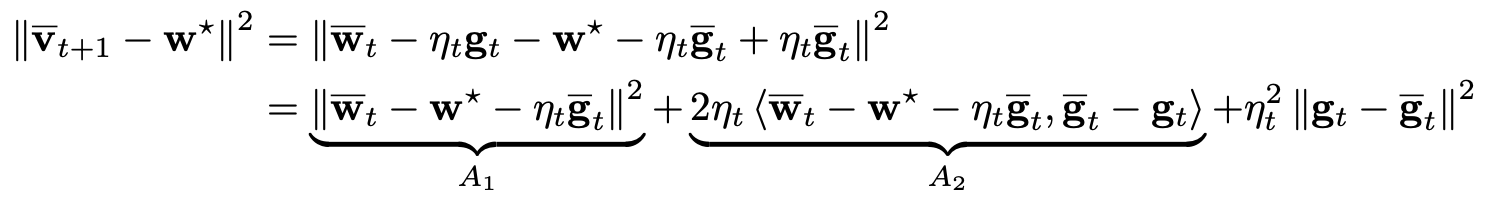 其中第一步直接由定义得出。特别的,作者引入了真实梯度 g ˉ t \bar{\bm{g}}_t gˉt (gradient averaged over users and all data) 来替换掉随机梯度 g t \bm{g}_t gt (stochastic gradient averaged only over users),因为 g ˉ t \bar{\bm{g}}_t gˉt更好处理。第二步由向量模的基本运算得到 (想回顾的同学 [2] 中有)。特别的,因为 E ( g t − g ˉ t ) = 0 \mathbb{E}(\bm{g}_t -\bar{\bm{g}}_t)=0 E(gt−gˉt)=0, 所以中间项 A 2 A_2 A2 的均值为0.