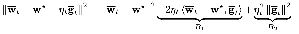 好,我们现在已经成功剥离出上一时刻的 w ˉ t \bar{\bm{w}}_t wˉt 与 w ∗ \bm{w}^* w∗ 的距离了 (即第一项)。接下来继续 bound B 1 {B}_1 B1 and B 2 {B}_2 B2.