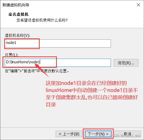 6. 按照自己需求填写虚拟机名称和虚拟机所在位置,然后“下一步”