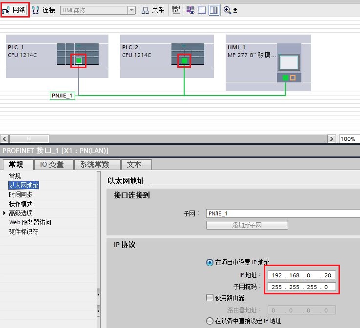插入两台cpu,分配IP地址,并在网络视图下将两个PLC的网口连接起来