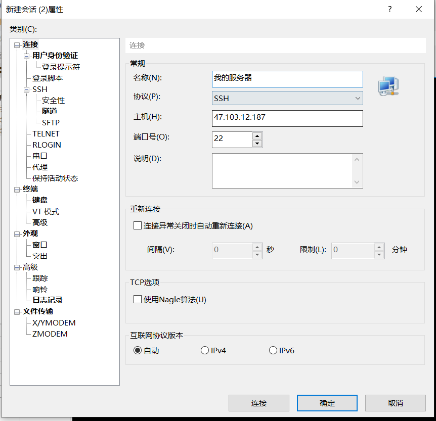 打开Xshell新建连接,名称自己起一个,主机写自己服务器的公网地址,协议不需要更改。端口选择22(默认的,所以刚刚需要开启22端口)