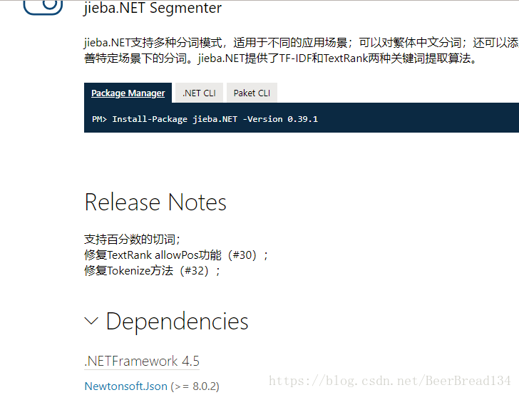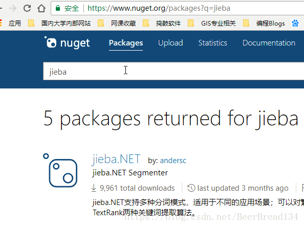 Packages页面下搜索jieba,点击第一个jieba.NET。