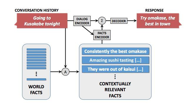 上图的模型提出了一种全新的、完全由数据驱动的、基于知识的神经对话模型,目的是在没有槽位的情况下产生更多的内容。作者归纳了广泛使用的SEQ2SEQ方法,通过对会话历史和外部“事实”的响应