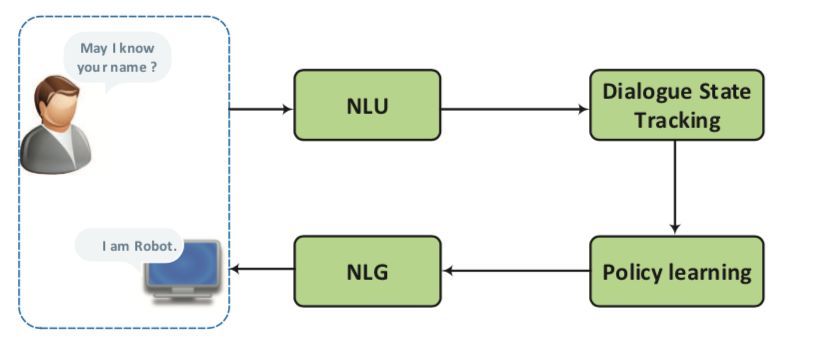 系统首先理解人类所传达的信息,将其作为一种内部状态,然后根据对话状态的策略采取一系列相应的行为,最后将动作转化为自然语言的表现形式。