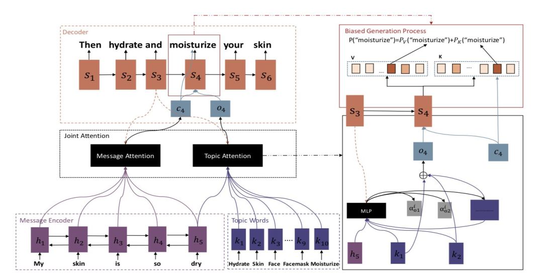 在下图的模型中,作者注意到人们经常把他们的对话与主题相关的概念联系起来,并根据这些概念做出他们的回复。他们使用Twitter LDA模型来获取输入的主题,将主题信息和输入表示输入到一个联合注意模块中,并生成与主题相关的响应。