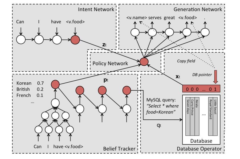 上图的模型是一种基于网络的端到端可训练任务导向型对话系统,将对话系统的学习作为学习从对话历史到系统回复的映射问题,并应用encoder-decoder模型来训练。然而,该系统是在监督的方式下进行训练——不仅需要大量的训练数据,而且由于缺乏对训练数据对话控制的进一步探索,它也可能无法找到一个好的策略。