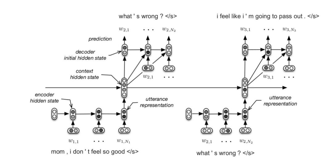 在上图中,作者通过代表整个对话历史(包括当前的信息),用连续的表示或嵌入单词和短语来解决上下文敏感回复生成的这一难题。