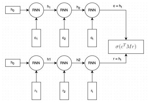 下图的方法通过RNN/LSTM的结构将上下文(所有之前的话语和当前消息的连接)和候选响应分别编码到上下文向量和回复向量中,然后根据这两个向量计算出匹配度分数。
