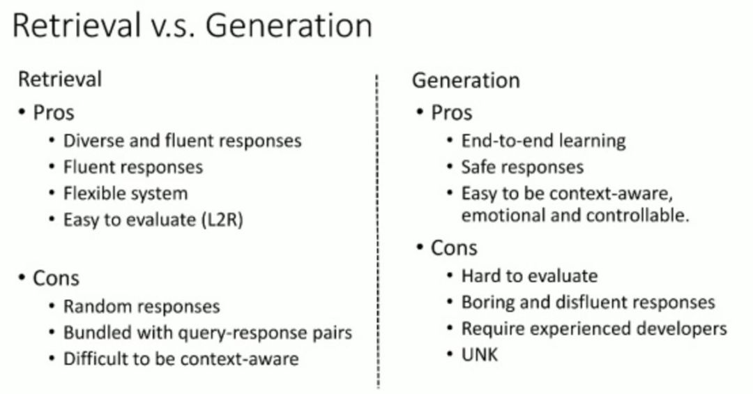 生成模型能够生成更合适的回复,而这些回复可能从来没有出现在语料库中,而基于检索的模型则具有信息充裕和响应流畅的优势。