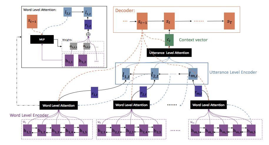 在上图的结构中作者引入两个层次的Attention机制,让模型能够自动的学到词语与句子级别的重要度信息,从而更好的生成新一轮的对话。