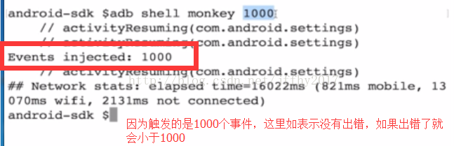 1000告诉monkey帮助完成1000个指令,包括home键,滑屏减等等;