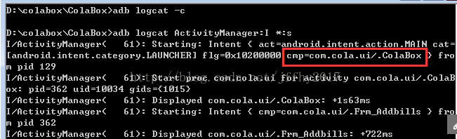 启动logcat,使用命令adb logcat AcitivityManager:I*:s