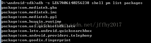 D:adb -s LE67A06140256238 shell pm list packages | find /I "LETV"