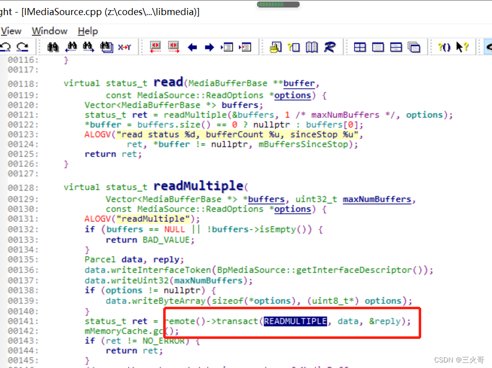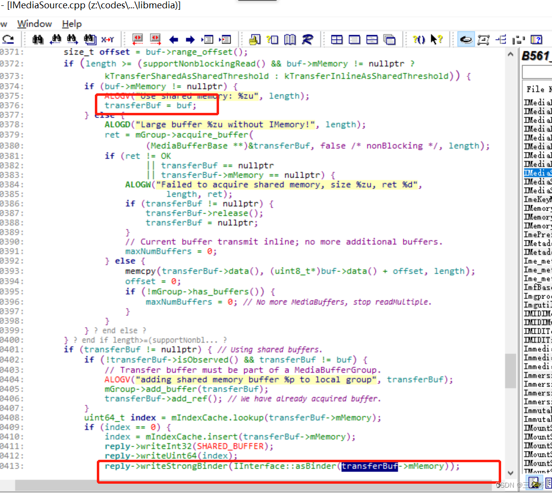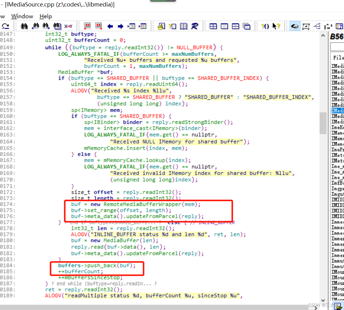 可以看出从MPEG4Extractor.cpp中read的MediaBuffer *buf后面传给了MediaBuffer *transferBuf,reply的强指针就是transferBuf的mMemory(IMemory),BpMediaSource中接收了mMemory转换成了IMemory,然后将该IMemory传到RemoteMediaBufferWrapper对象中,后面将这个buf放到buffers(Vector<MediaBufferBase *>)的数组中:buffers->push_back(buf),到这里就把这个IMemory传出去了。