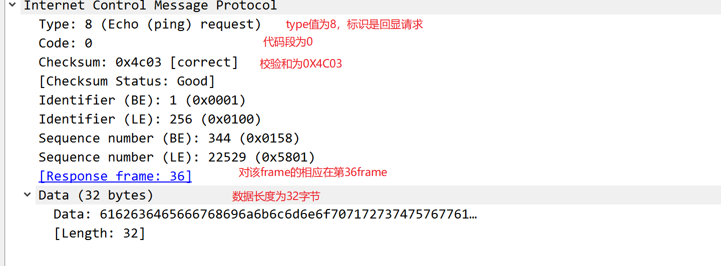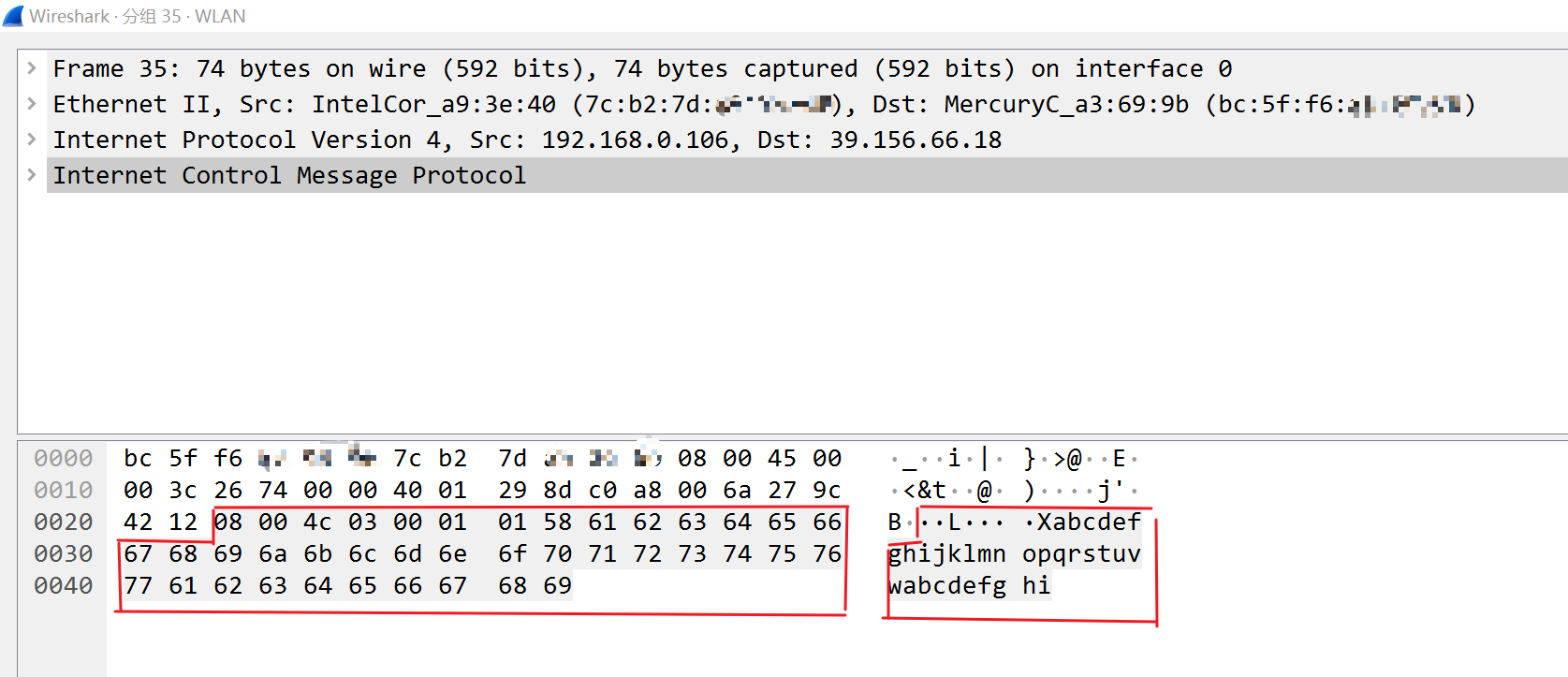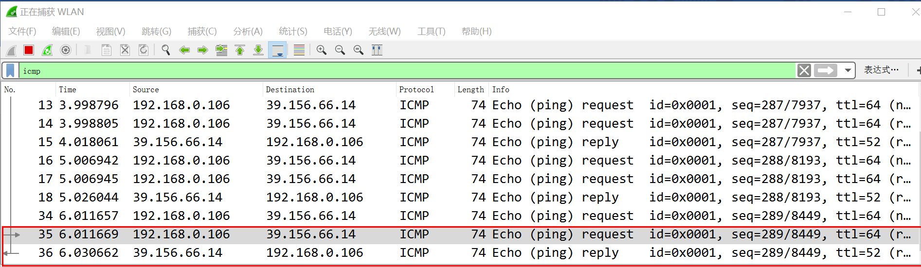 可以看到利用wireshark抓取的icmp如下,跟上面的icmp数据包可以对应起来。