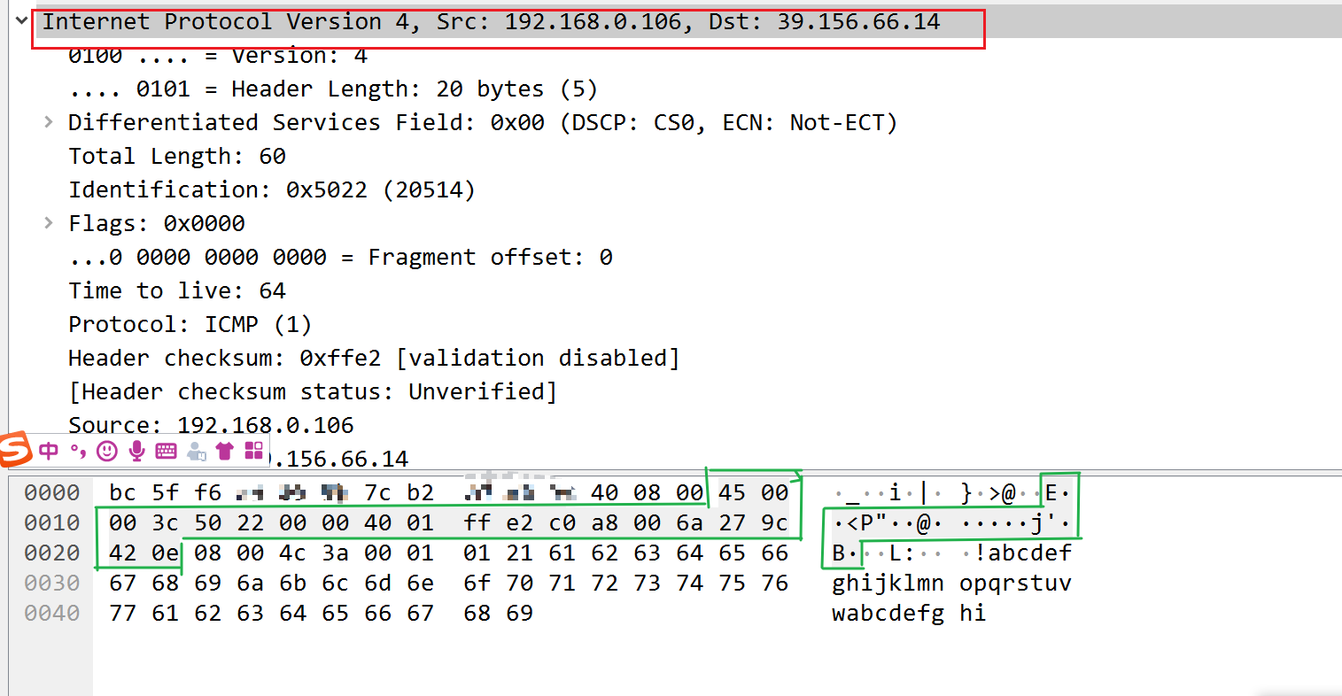 我们先看一下IP数据包的格式,它包括IP手部和数据部分,数据部分在本例中就是ICMP数据包。