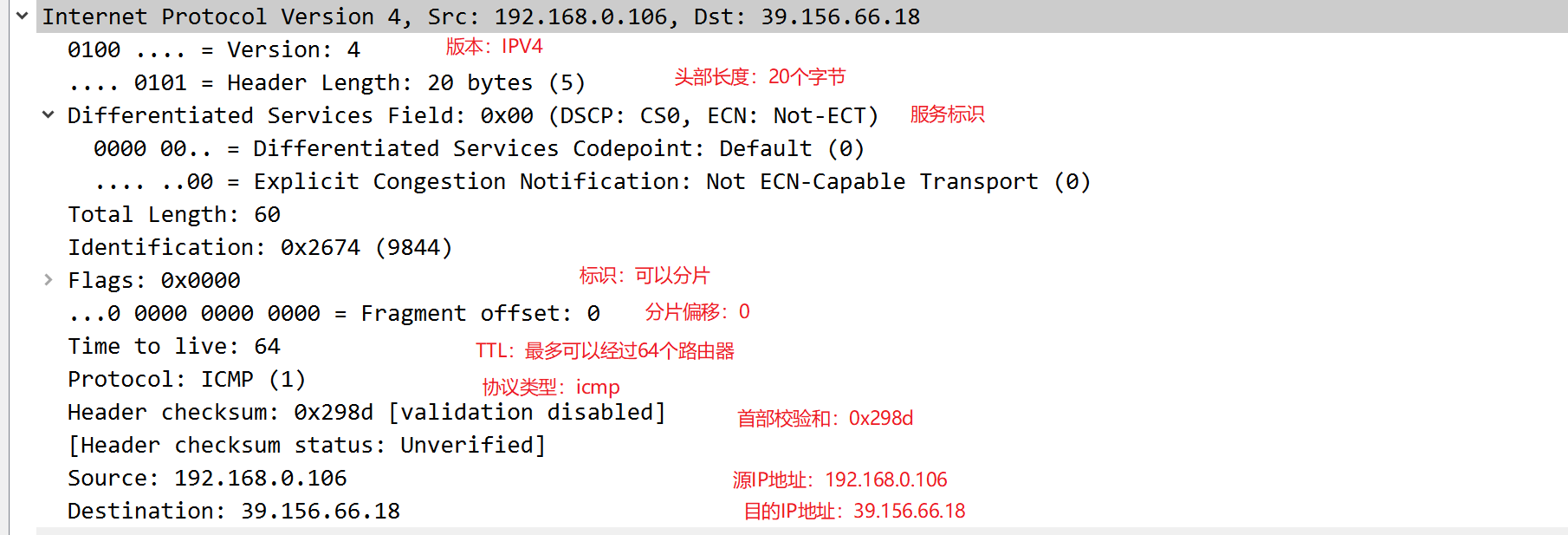 | 目的地址 | 占据4个字节,目的IP地址 |