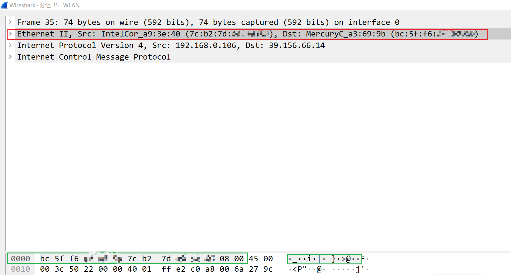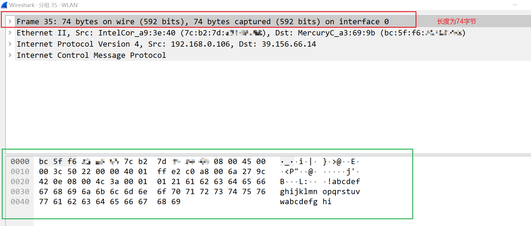 双击第35帧数据包,可以得到如下的显示结果。点击数据链路层报文(红色方框标注的地方),可以看到整个74字节的报文内容(绿色方框圈起来的地方)就被选中了,这说明ping request数据链路层报文一共有74个字节。