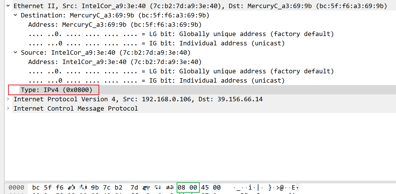 | 类型 | 占据2个字节,标识上层协议的类型,常见的:0x8000标识IPV4,0x806标识ARP,0x0835标识RARP |