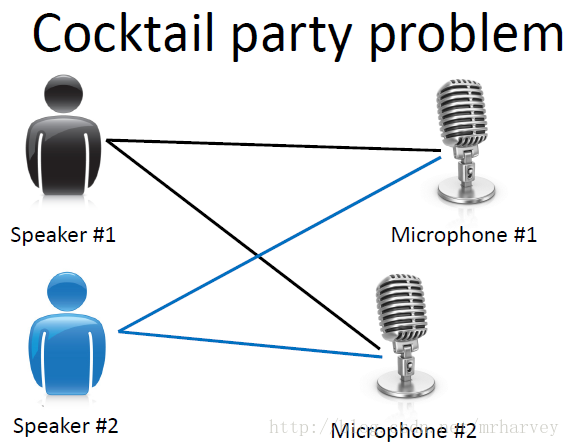 提到独立成分分析就不得不说著名的“鸡尾酒会问题”,如图1所示意。该问题描述的是一场鸡尾酒会中有N个人一起说话,同时有N个录音设备,问怎样根据这N个录音文件恢复出N个人的原始语音。鸡尾酒会问题也叫做盲源分离问题,ICA就是针对该问题所提出的一个算法。