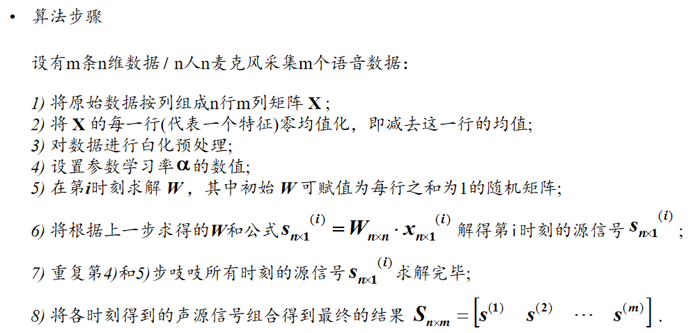 经过中间一系列计算步骤(这里不一一展现),最后得到了ICA算法的实现步骤如图3所示(仍然是PPT代劳):