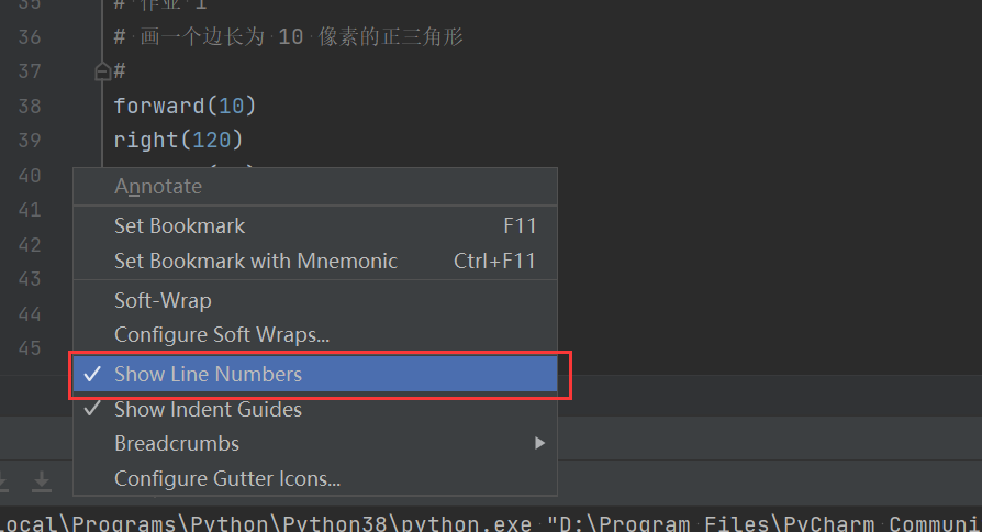 def sjjcxy():n = 3x = 100nzjc = (n - 2) * 180 / ndegree = 180 - nzjci = 0while i < n:forward(x)right(degree)i = i + 1sjjcxy()