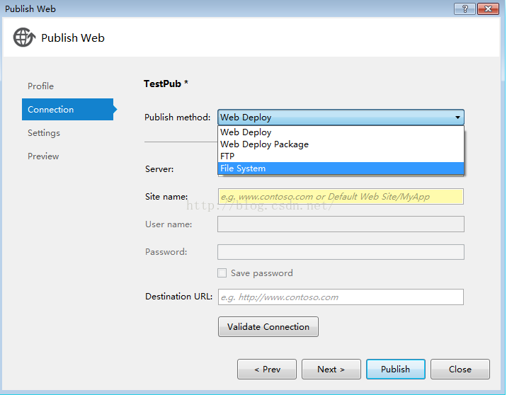 5、局域网发布的话,一般点File System即可。如果要发布到阿里云服务器这样可以对外的,可以用FTP