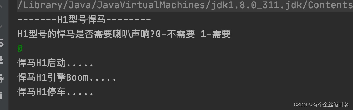 class Client{public static void main(String[] args) {System.out.println("-------H1型号悍马--------");System.out.println("H1型号的悍马是否需要喇叭声响?0-不需要 1-需要");String type = new Scanner(System.in).next();HummerH1Model hummerH1Model = new HummerH1Model();if (type.equals("0")){hummerH1Model.setAlarm(false);}hummerH1Model.run();}