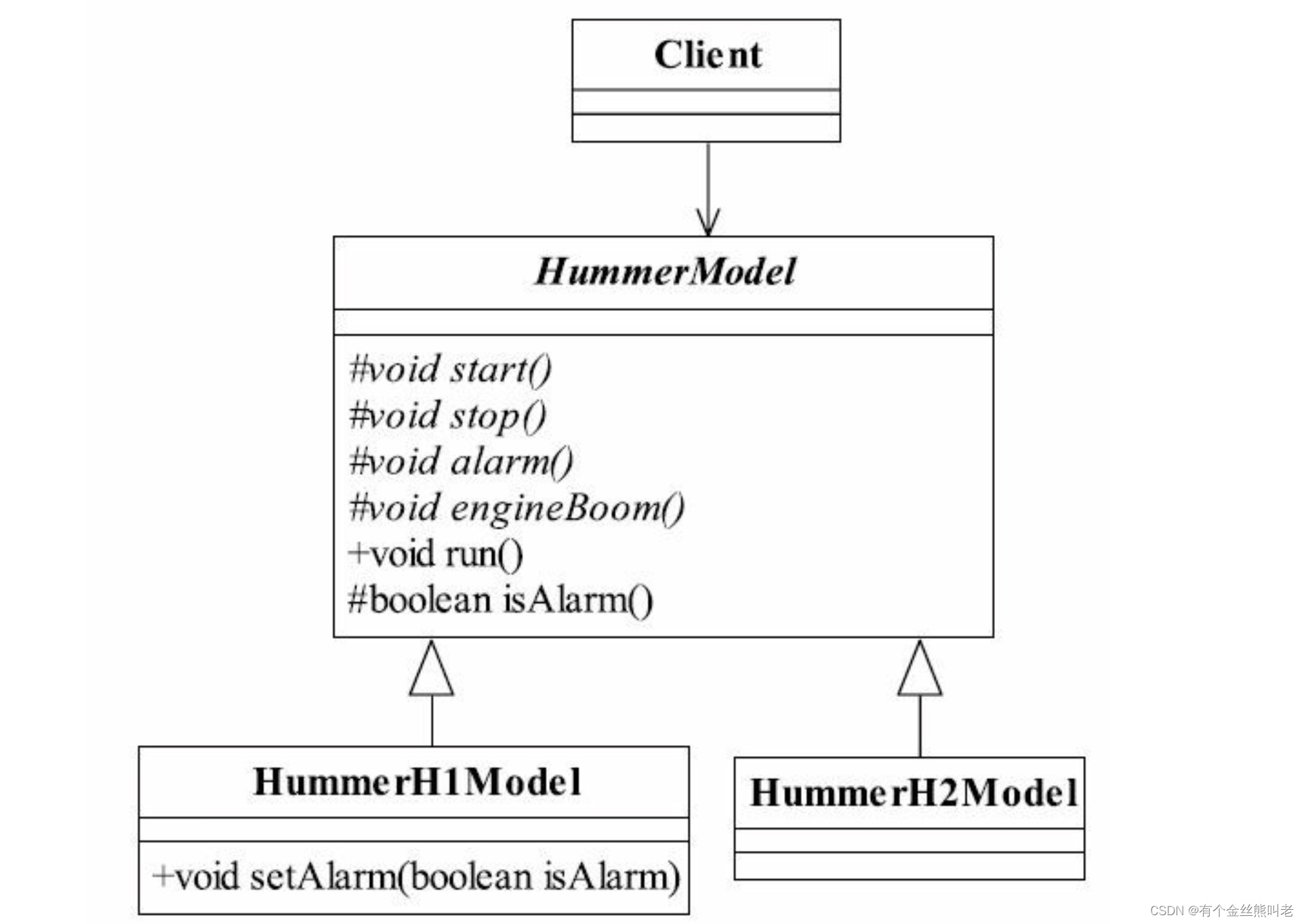 class Client{public static void main(String[] args) {HummerModel hummerH2Model = new HummerH2Model();//H2模型演示hummerH2Model.run();}