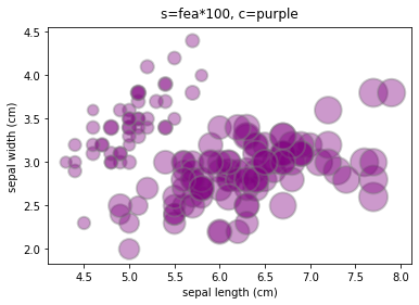 plt.title('s=fea*100, c=purple',verticalalignment='bottom')
