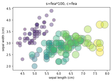 #参数说明# s:表征气泡大小的变量# c:颜色,若想要彩色气泡,可以给c赋值,如c=fea# alpha:不透明度# edgecolors:气泡描边的颜色# linewidth:气泡描边大小