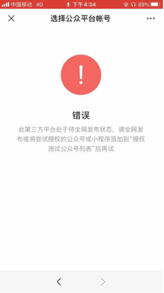 问题1:测试未发布,“授权测试公众号/小程序列表”的列表页添加了测试公众号的原始ID,但是扫码就是提示错误"此第三方平台处于待全网发布状态,请全网发布或将尝试授权的公众号或小程序添加到授权测试公众号列表后姿势"如下图,无法授权