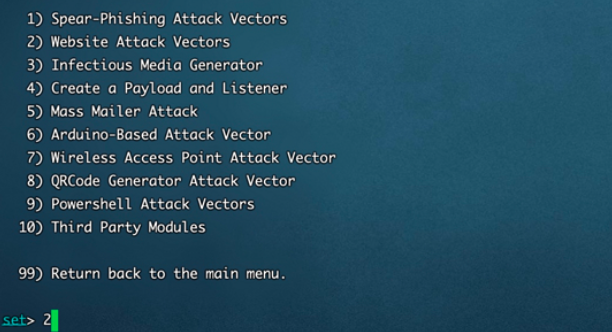 2、接下来选择第二项Website Attack Vectors (网站攻击载体)