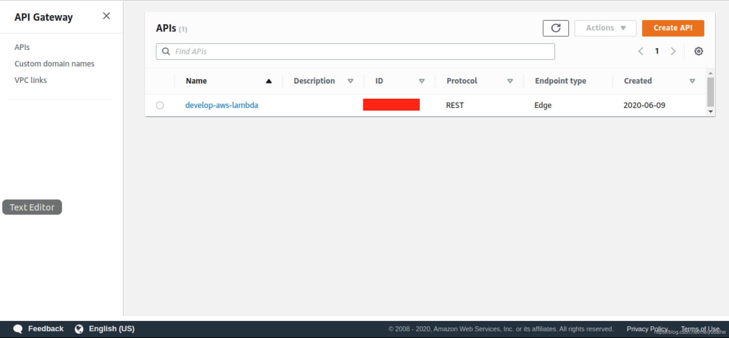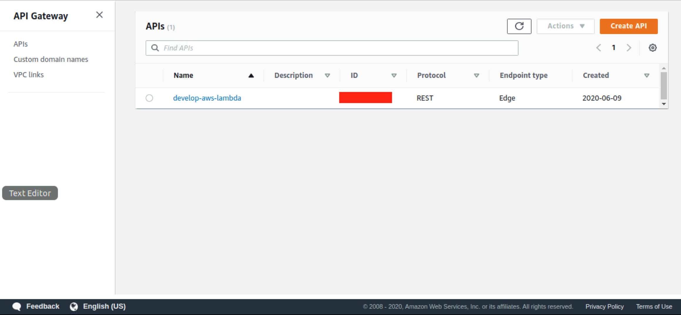 在api列表中可以找到刚部署的名为 develop-aws-lambda的api: