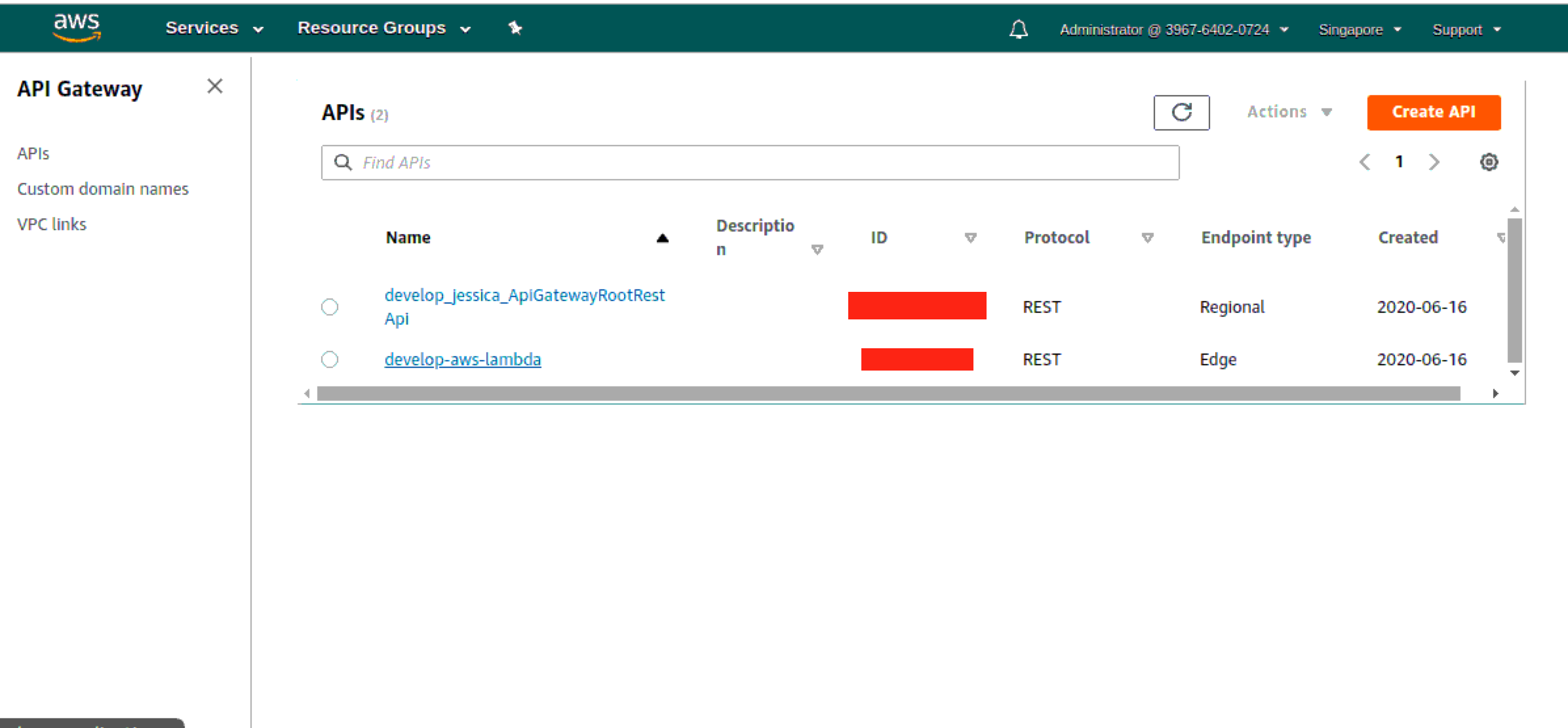 打开apigateway的页面:https://ap-southeast-1.console.aws.amazon.com/apigateway/main/apis?region=ap-southeast-1