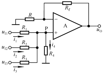 u o = R p ( u I 1 R 1 + u I 2 R 2 + u I 3 R 3 ) R + R f R u_o = R_p(\frac{u_{I1}}{R_1} + \frac{u_{I2}}{R_2} + \frac{u_{I3}}{R_3})\frac{R + R_f}{R} uo=Rp(R1uI1+R2uI2+R3uI3)RR+Rf
