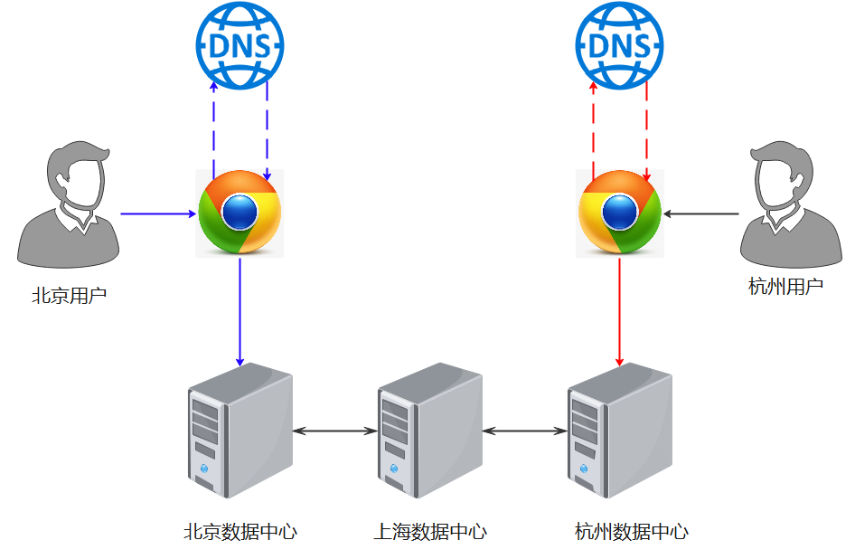 原理:当用户访问域名的时候(如www.taobao.com),会先向DNS服务器去解析域名对应的IP地址,这个时候我们可以让DNS服务器根据不同地理位置的用户返回不同的IP。比如杭州的用户就返回淘宝在杭州业务服务器的IP,北京的用户来访问的话,就返回淘宝在北京业务服务器所在的IP。