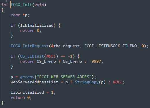 会进行 FCGI的初始化 ,然后也将FCGI_LISTENSOCK_FILENO赋予linsten_socket. FCGI_LISTENSOCK_FILENO fcgi和spwan-fcgi的定义是一样的都是0,这样cgi程序也就和 spwan-fcgi一样获得了 对ip 和端口 对应的 listen fd。
