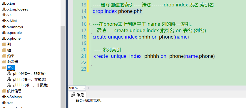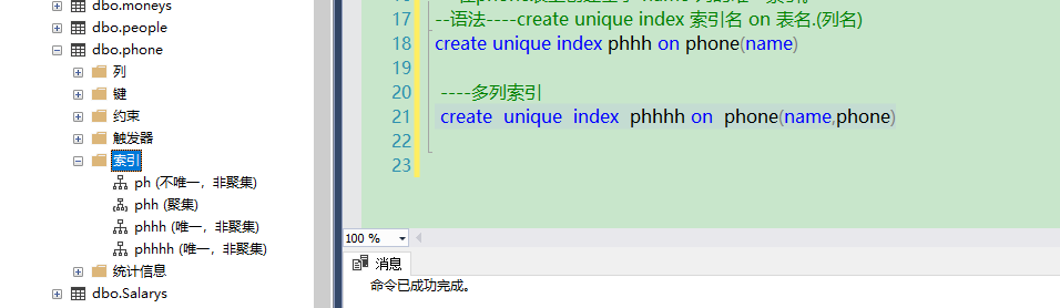 create unique index phhh on phone(name)----多列索引create  unique  index  phhhh on  phone(name,phone)--------------------全文检索---------------------创建一个默认的全文目录 ft --