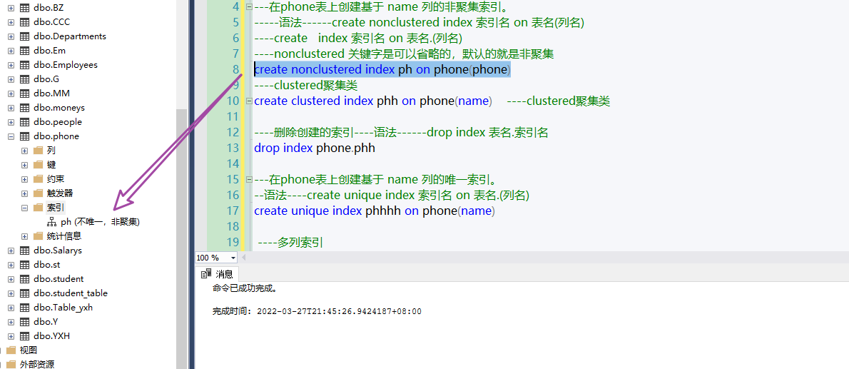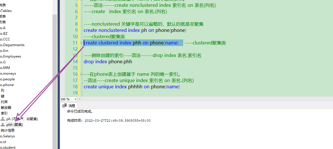 create clustered index phh on phone(name)    ----clustered聚集类----删除创建的索引----语法------drop index 表名.索引名