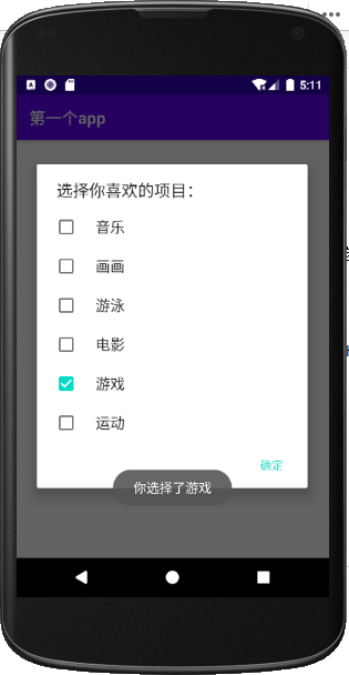 b.setMultiChoiceItems(items, checks, new DialogInterface.OnMultiChoiceClickListener(){@Overridepublic void onClick(DialogInterface dialog, int which, boolean isChecked) {Toast.makeText(MainActivity.this, "你选择了"+items[which], Toast.LENGTH_SHORT).show();}